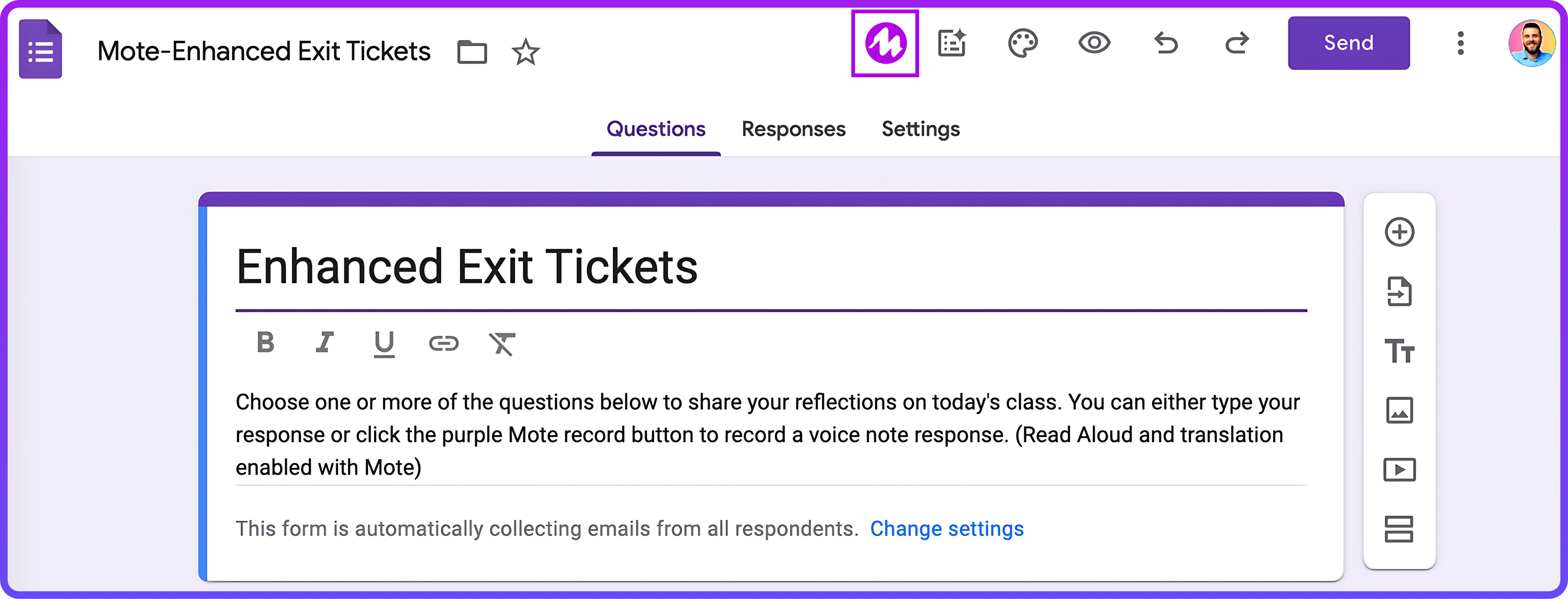 Step 1️⃣: Activate Auto Read Aloud after clicking the Mote button at the top of a Google Form.